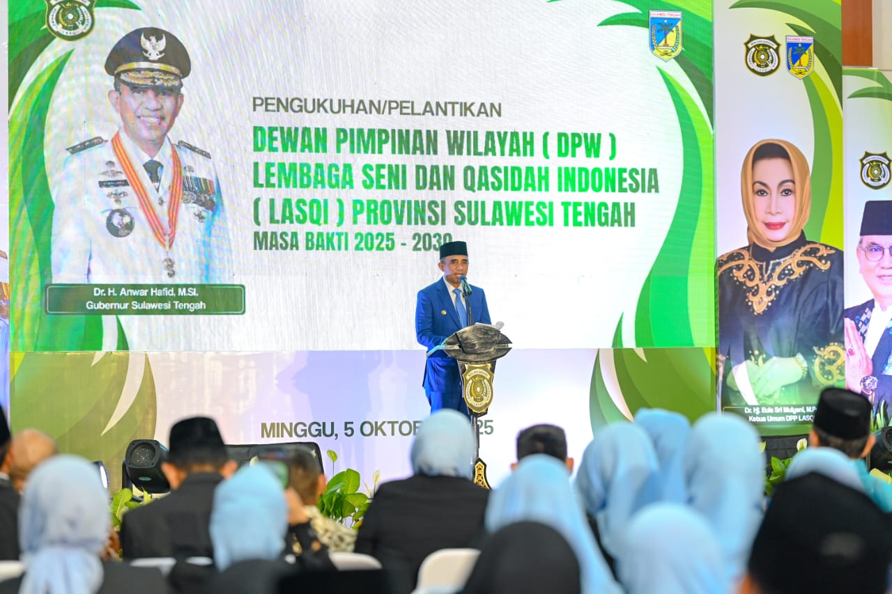 Palu (deadlinews.com) – Gubernur Sulawesi Tengah, Anwar Hafid, menyampaikan apresiasi dan ucapan selamat kepada jajaran pengurus Dewan Pimpinan Wilayah (DPW) Lembaga Seni dan Qasidah Indonesia (LASQI) Provinsi Sulawesi Tengah periode 2025–2030 yang baru saja dikukuhkan di Gedung Pogombo, Minggu (5/10).